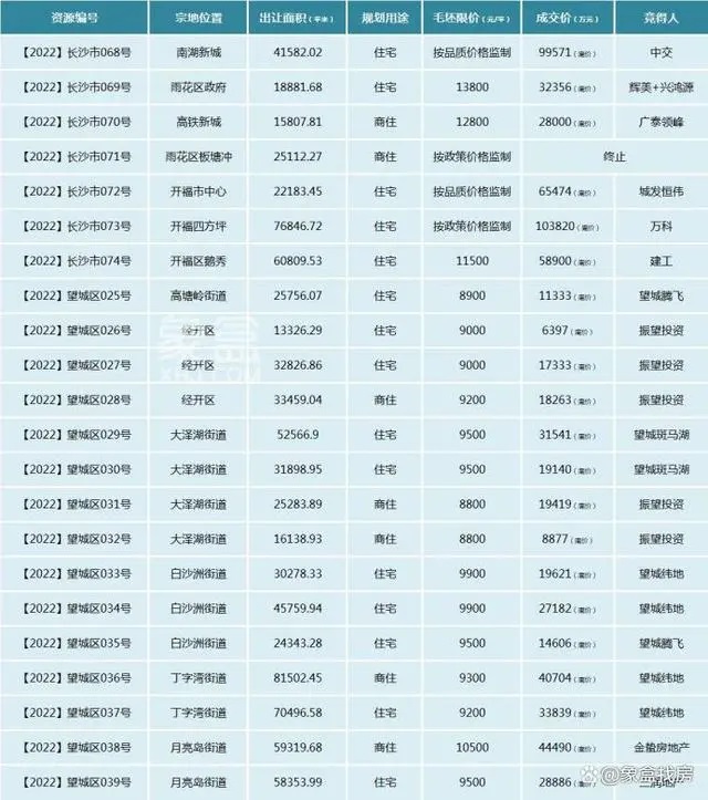 再来看看本次土拍供地大户望城区,共15宗地块全部底价成交,但从开发商来看就黯淡许多,基本都是望城本土国有房企,其中振望投资拿下5宗地、望城纬地拿下4宗地、望城腾飞和望城斑马湖分别拿下两宗,唯一看着眼熟的是三润地产,拿下月亮岛街道039号地块。