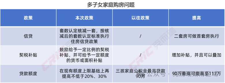 从三个方面提出政策支持。一是二孩及以上且子女未成年家庭购房时,在拟购房所在县(市、区)已有住房的,套数认定核减一套,按核减后的套数认定标准执行住房信贷政策;二是对二孩及以上且子女未成年家庭购买首套、二套房的,鼓励给予一定比例的契税补贴,并可给予一定额度的货币或面积补贴;三是合理提高二孩及以上且子女未成年家庭购房的公积金贷款额度上限,将二孩、三孩且子女未成年家庭贷款额度分别在现有额度上限基础上再提高不低于20%、30%。